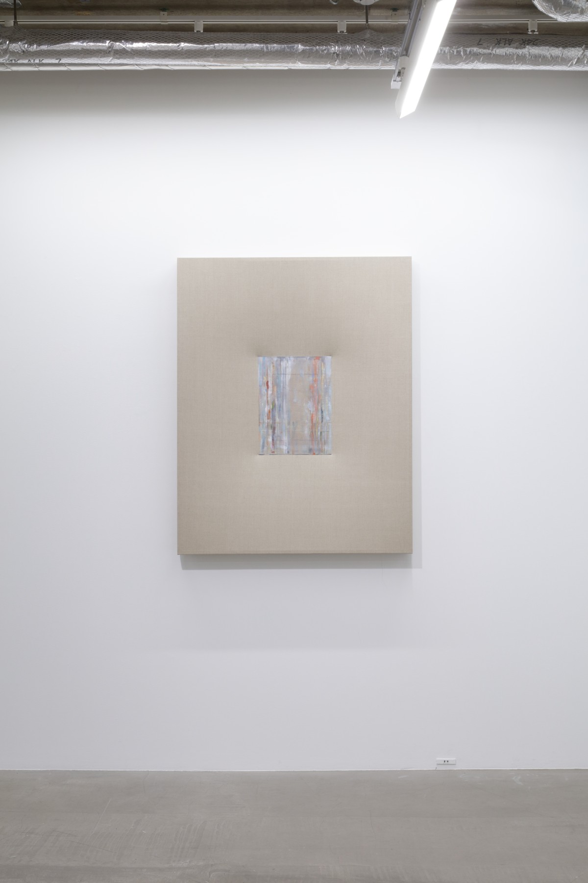 篠田の新作は、麻布のキャンバスにウサギ膠を引き、くるみ油をとき油として使用するなど、油彩画の基本的な素材を用いて制作されています。しかしそれは、私たちが見慣れたペインティングとは一風異なっており、この作品を前にして、どの位置でどのくらいの距離から観るべきなのか、迷いが生じます。麻布のキャンバス自体が大きな余白を作り、その余白は、端から中心部に向かって曲面を描きながら5センチほど窪んでいきます。中心部は平面となっており、抽象的な色の構成やグリッド状の線が、油絵の具によって描かれています。