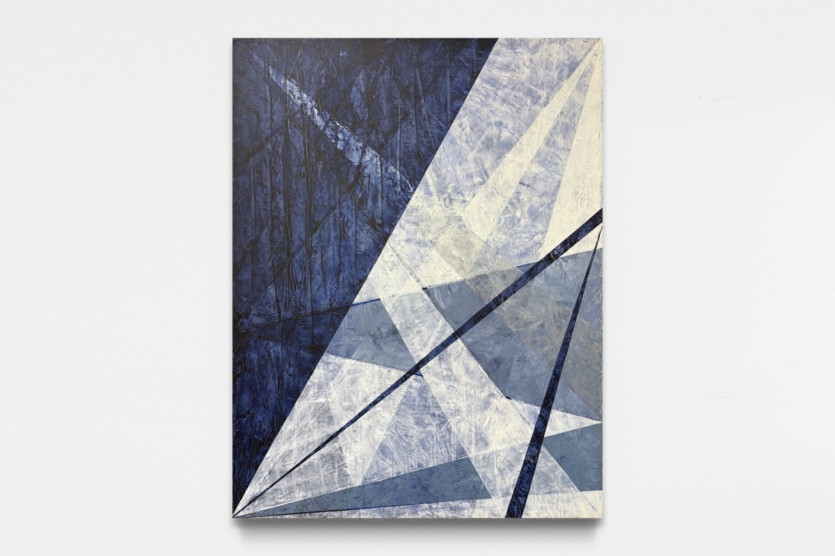 前田紗希の絵画は、構成と偶然、抽象と物質感、感覚と理性のあいだに生まれる緊張と調和を精緻に保ち続けています。画面を斜めに横切る線、重なり合う三角形のレイヤー、慎重に制御された色面は、均衡を保ちながらも、常に崩れうる可能性を孕んでいます。油彩におけるペインティングナイフの独自の使用法によって生み出されるマチエールは、擦りガラスのように画面を覆い、見る者に「その奥」を想像させます。青を基調としつつ、金・銀・白・黒などが差し込まれることで、前景と背景、光と影が反転するような視覚的揺らぎが生じ、二次元と三次元を往還する感覚が静かに立ち上がります。最新作では、線に近い要素が加わることで、より張力の高い画面構成が生まれ、均衡と不安定さの境界が一層研ぎ澄まされています。